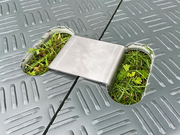 Kuumaupotetusta sinkitystä Magnelis-teräslevystä valmistetut kahvaliittimet tarjoavat käytännöllisen ratkaisun TempoTrax-maansuojausmattojen liittämiseen tasaisilla alustoilla. Liittimet mahdollistavat mattojen nopean ja tehokkaan yhdistämisen toisiinsa.